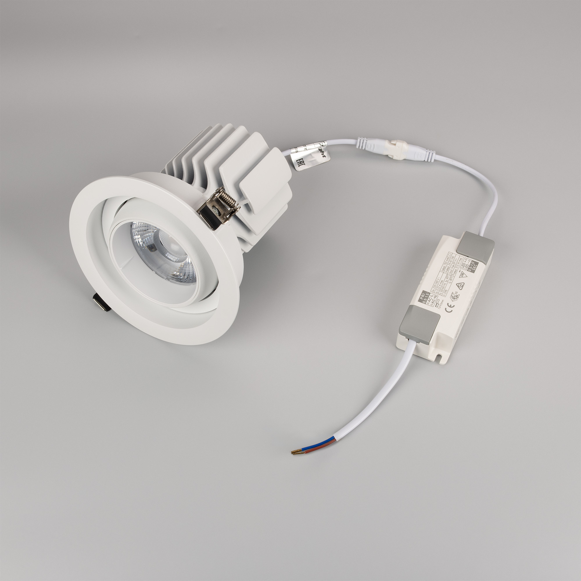 Встраиваемый карданный поворотный светильник с высоким индексом цветопередачи CRI>92 предназначен для создания качественного освещения. За основу поворотного механизма светильника взят принцип кардана – подвижное соединение двух колец, вложенных одно в другое. Световой модуль вращается вокруг своей оси на 360 градусов и отклоняется от горизонта на 30 градусов, что позволяет с лёгкостью регулировать направление пучка света и его концентрацию на определенной зоне. Особая конфигурация корпуса из алюминия оригинально смотрится в интерьере и позволяет эффективно отводить тепло. Светильник с углом рассеивания 30 градусов отлично подходит как для локальной акцентной подсветки витрин, прилавков магазинов, бутиков и стендов выставочных залов, так и для общего освещения. Легко устанавливается с помощью пружин в монтажное отверстие потолка. В комплекте поставляется драйвер, что позволяет безопасно и быстро подключать светильник напрямую к сети переменного тока 230 В.